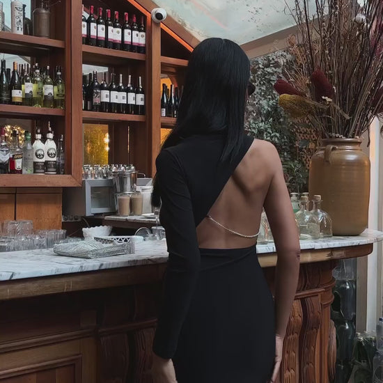 Deze elegante, verfijnde jurk met open rug en ketting detail is een onmisbare aanvulling op je garderobe. Met haar perfecte pasvorm accentueert deze jurk je figuur op een elegante manier. Met op de rug laag uitgesneden en een verfijnd kettingdetail krijg je een elegante en verleidelijke uitstraling die je zelfvertrouwen een boost geeft.